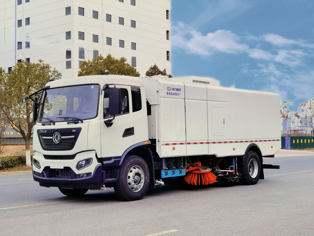 該洗掃車的清掃系統采用“中置兩立掃+中置寬吸嘴+吸嘴高壓中噴桿+左、右高壓側噴