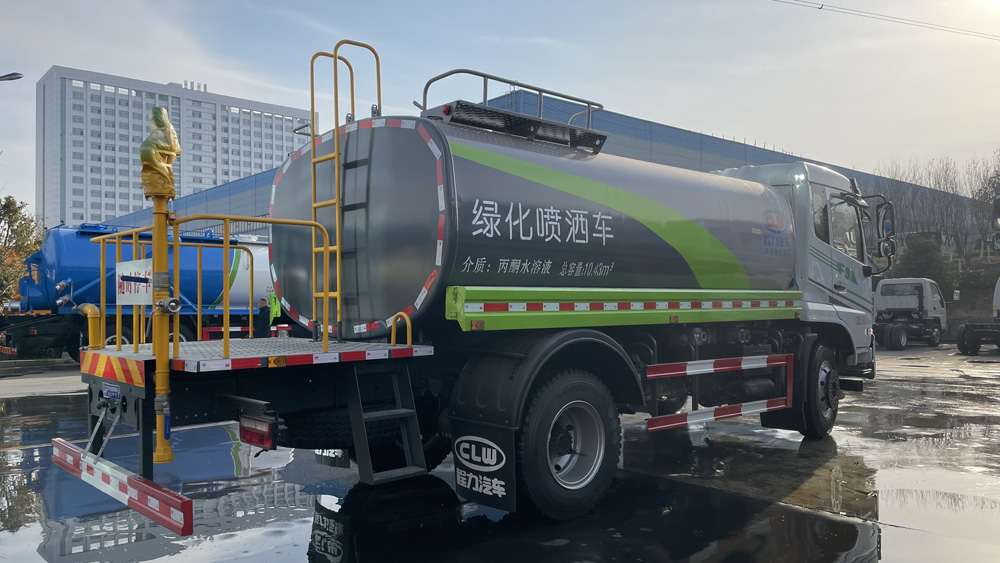 四、其他說明: 罐體由國標(biāo)5mm厚優(yōu)質(zhì)碳鋼板一次性卷壓成型,二保焊行走小車自動焊接,焊縫均勻、美觀,避免了人工焊接的漏焊和虛焊,罐體內(nèi)部加固處理,并設(shè)置防浪板,罐體內(nèi)外做防銹處理,標(biāo)配前沖、后灑、側(cè)噴、后置式工作平臺,平臺帶踏梯,四周有安全護欄,平臺上設(shè)有高壓水炮,可360°旋轉(zhuǎn),可調(diào)成:直沖狀、大雨、中雨、小雨、毛毛雨。