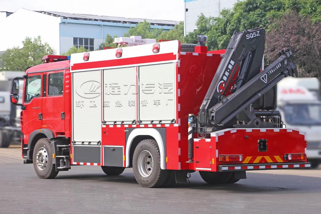 重汽豪沃搶險救援消防車,前拖后吊,具有起吊、自救/牽引、清障、發電、照明等功能,可裝備大量的破拆、偵檢、堵漏、防護等各類消防器材或工具;